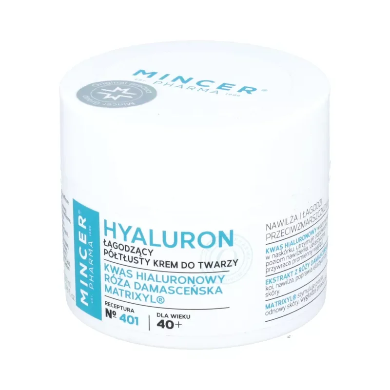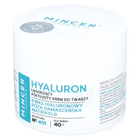 Krem Mincer Pharma Hyaluron 40+ wspiera codzienną pielęgnację wymagającej cery, dostarczając jej niezbędnego nawilżenia i odżywienia. Dzięki zawartości kwasu hialuronowego, róży damasceńskiej i peptydu MATRIXYL® skóra staje się bardziej elastyczna, gładka i ukojona. Regularne stosowanie poprawia komfort i wygląd cery, zmniejszając oznaki starzenia.