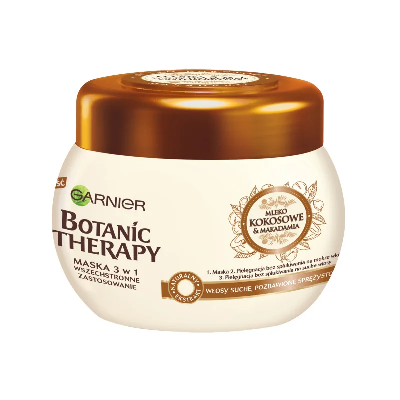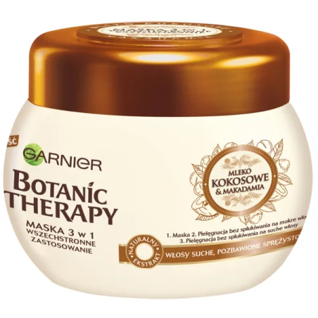 Pojemność: 300 ml. Składniki kluczowe: mleko kokosowe, olej makadamia. Typ kosmetyku: maska 3w1 do włosów. Odpowiednia do włosów suchych i zniszczonych. Testowana dermatologicznie.