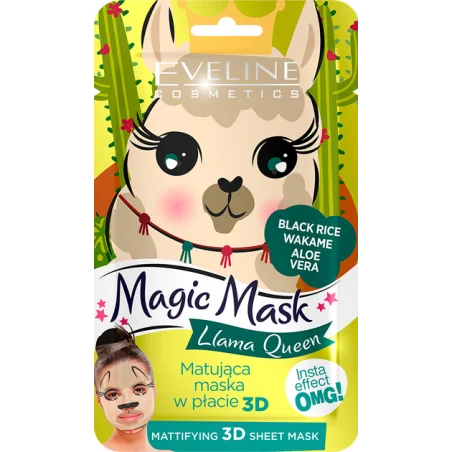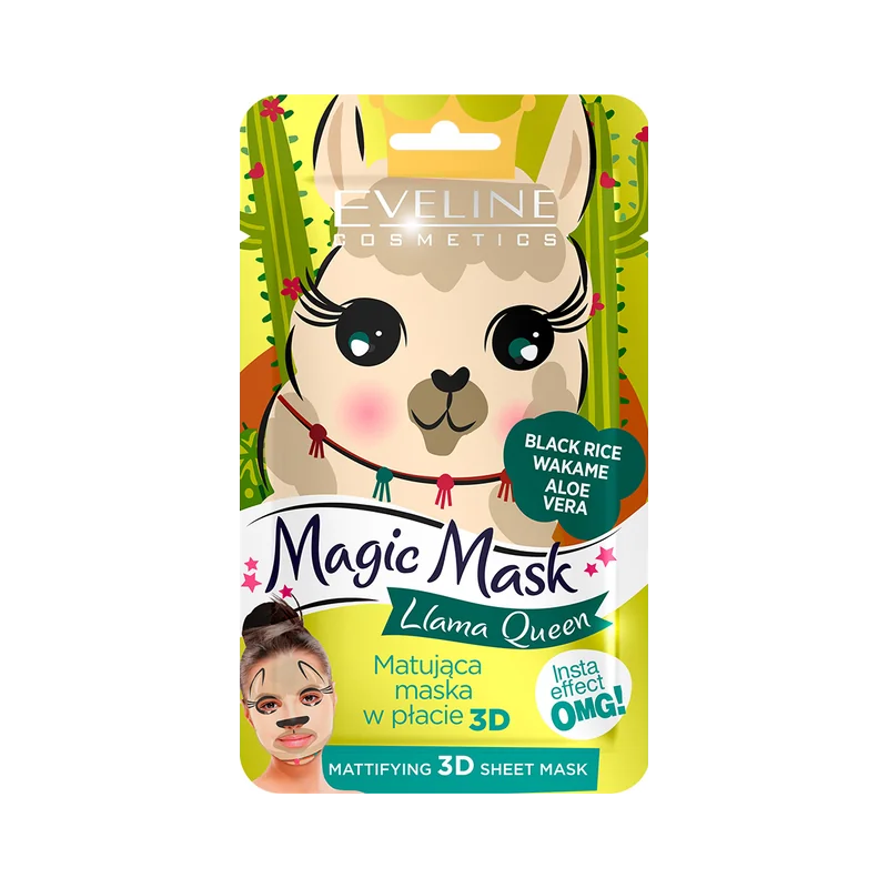 Matująca maska Eveline Cosmetics z serii Llama Queen to połączenie skutecznej pielęgnacji z zabawną, designerską formą. Nasączona skoncentrowanym serum maska działa błyskawicznie, redukując niedoskonałości i błyszczenie, jednocześnie zapewniając skórze ukojenie i zdrowy wygląd. Efekt? Perfekcyjnie matowa, świeża i wygładzona cera.