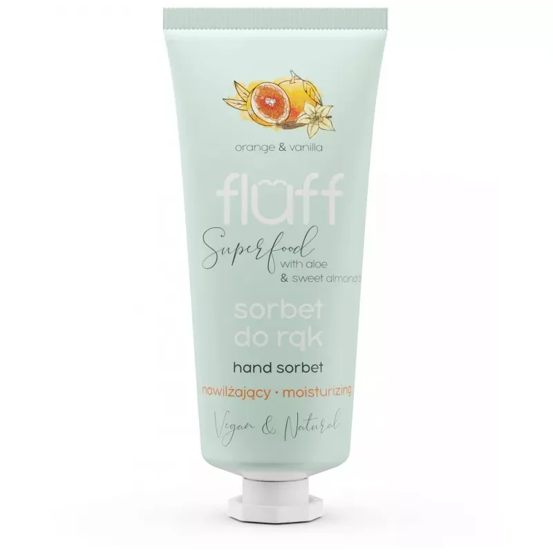 Fluff Sorbet do Rąk Pomarańcza & Wanilia to skuteczna pielęgnacja dla osób z suchymi i wrażliwymi dłońmi. Dzięki zawartości aloesu i oleju migdałowego skóra zostaje nawilżona, zregenerowana i wygładzona. Lekka formuła sprawia, że dłonie są miękkie i pachnące, a stosowanie jest szybkie i przyjemne.