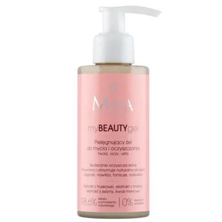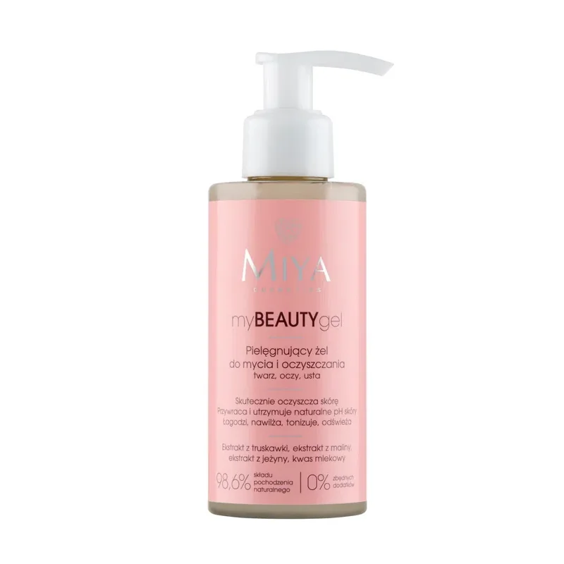 MIYA myBEAUTYgel to żel oczyszczający, który skutecznie usuwa zanieczyszczenia, jednocześnie pielęgnując skórę twarzy, oczu i ust. Dzięki naturalnym ekstraktom i łagodnej formule codzienne stosowanie pozostawia skórę odświeżoną, nawilżoną i pełną energii. Efekt końcowy: skóra wygląda zdrowo, jest miękka, promienna i gotowa na dalsze zabiegi pielęgnacyjne.