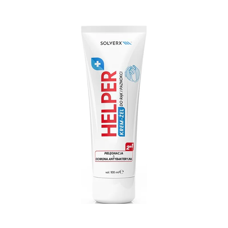Krem-żel Helper marki SOLVERX skutecznie łączy szybkie nawilżenie i regenerację dłoni oraz paznokci z ochroną antybakteryjną. Idealny dla osób często dezynfekujących ręce, zapewnia komfort, gładkość skóry oraz zdrowy wygląd paznokci, bez pozostawiania tłustego filmu.