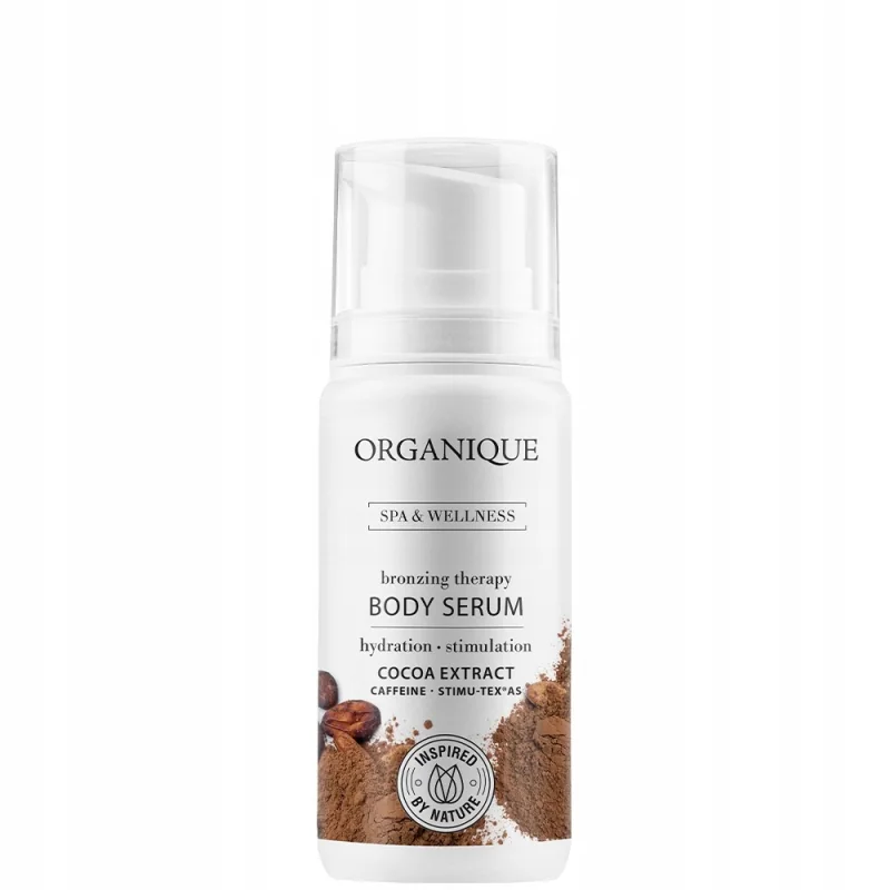 Organique Brązujące Serum do Ciała Bronzing Therapy łączy pielęgnację z efektem lekkiej opalenizny. Ekstrakt z kakaowca i STIMU-TEX®AS poprawiają mikrokrążenie i chronią skórę przed podrażnieniami, a olej arganowy intensywnie nawilża i odżywia. Regularne stosowanie wygładza skórę, nadaje jej promienny wygląd i wspomaga redukcję tkanki tłuszczowej.