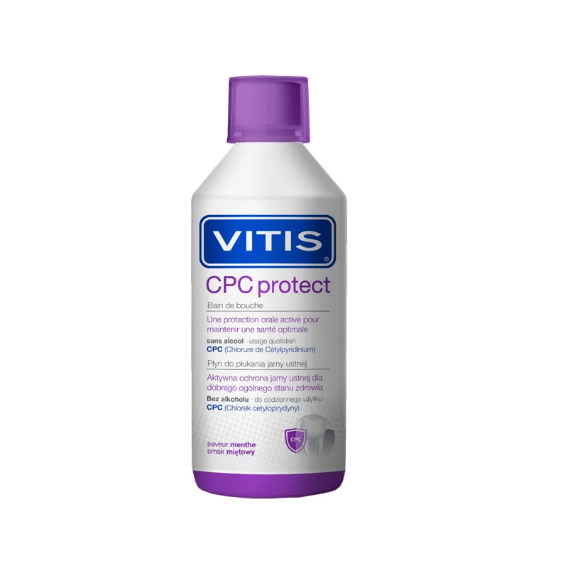 Płyn do płukania jamy ustnej Vitis CPC Protect to specjalistyczny produkt opracowany z myślą o kompleksowej ochronie jamy ustnej. Skład oparty na chlorku cetylopirydyny (CPC) działa przeciwwirusowo i wspiera codzienną higienę, zapewniając długotrwałe uczucie świeżości. Dzięki miętowej formule płyn skutecznie odświeża oddech, wspomaga walkę z bakteriami i stanowi doskonałe uzupełnienie szczotkowania zębów.