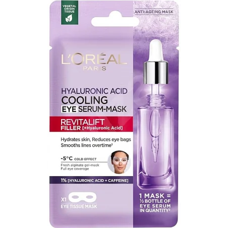 Chłodząca maska Revitalift Filler L’Oréal Paris to intensywna pielęgnacja skóry wokół oczu, która nawilża, wygładza i redukuje oznaki zmęczenia. Dzięki zawartości czystego kwasu hialuronowego i kofeiny, maska działa przeciwzmarszczkowo, poprawia jędrność skóry, a także zmniejsza widoczność cieni i worków pod oczami. Lekka, galaretkowata konsystencja zapewnia przyjemny efekt chłodzenia i komfort stosowania.