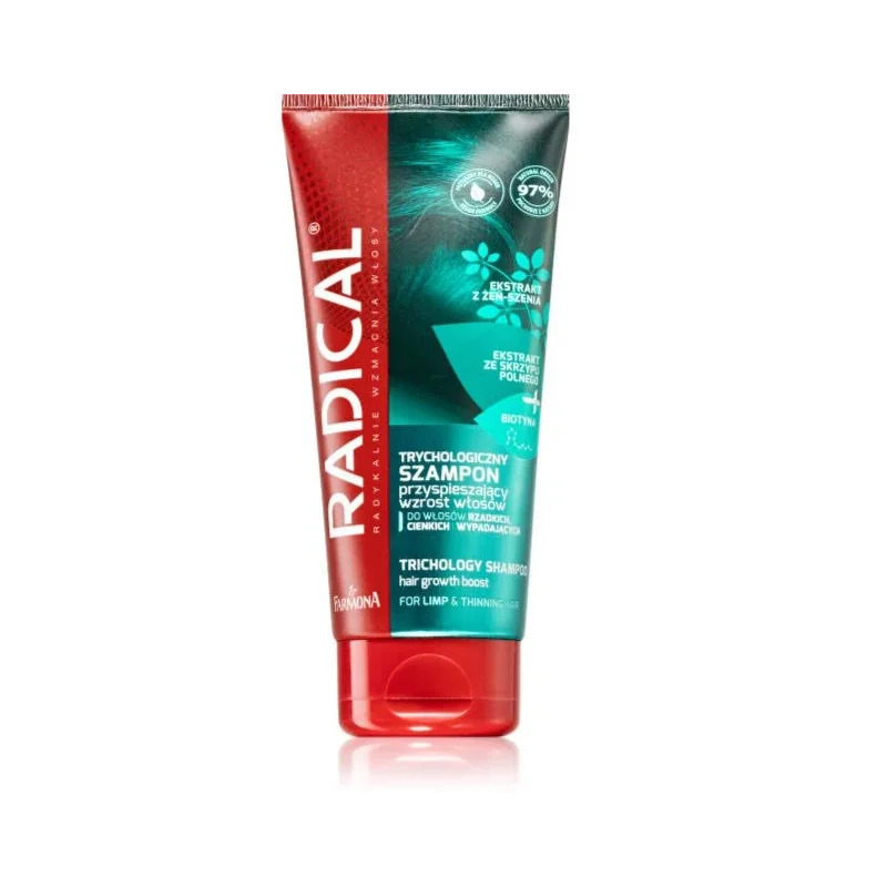 Farmona Radical Trychologiczny Szampon przyspieszający wzrost włosów to innowacyjna kuracja dla włosów osłabionych, cienkich i przerzedzonych. Skoncentrowana, wegańska formuła wzmacnia cebulki, poprawia gęstość włosów i stymuluje ich wzrost. Regularne stosowanie poprawia kondycję skóry głowy i włosów, nadając im zdrowy wygląd, elastyczność i witalność.