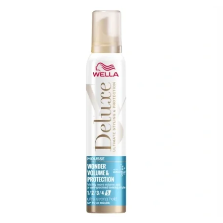 Ultra mocna pianka do włosów Wella Deluxe Wonder Volume & Protection to połączenie skutecznej stylizacji i intensywnej ochrony. Dzięki innowacyjnemu kompleksowi KERASHIELD 5™ włosy są odporne na uszkodzenia, zachowują zdrowy wygląd, połysk i sprężystość. Pianka nadaje im naturalną objętość i utrwala fryzurę nawet przez 24 godziny. Lekka formuła z olejkiem jojoba i pantenolem zapewnia włosom miękkość i gładkość bez uczucia obciążenia.