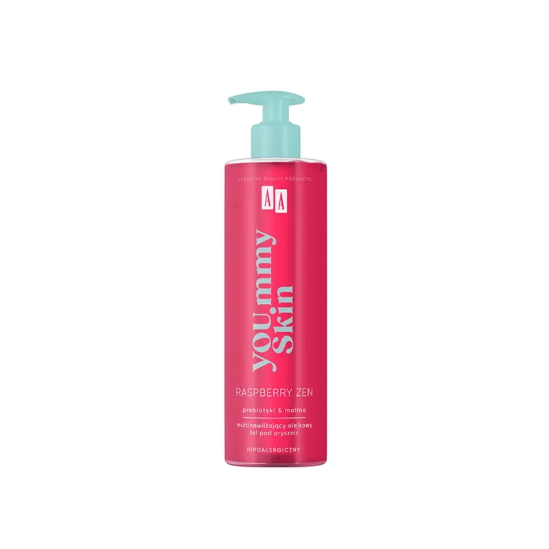 AA YOU.mmy Skin Olejkowy Żel Pod Prysznic to pielęgnacja skoncentrowana na działaniu – łączy skuteczność i przyjemność stosowania. Multinawilżająca formuła z prebiotykami, maliną i niacynamidem łagodzi podrażnienia, odżywia oraz