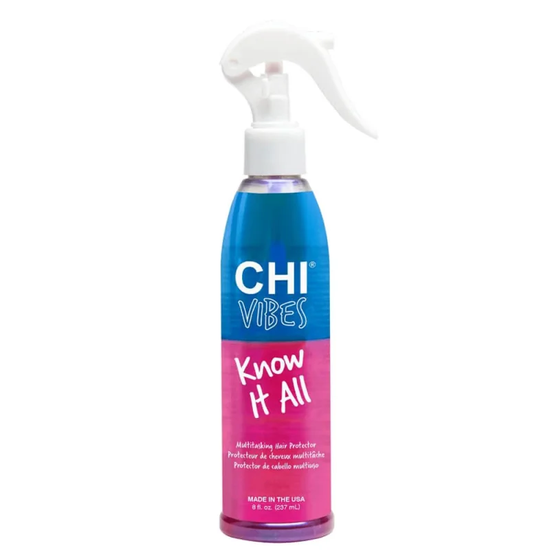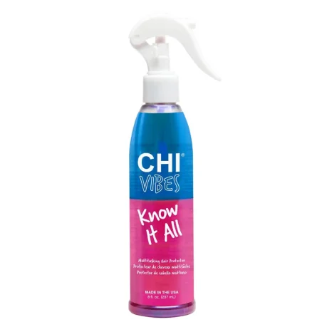 Chi Vibes Know It All to profesjonalny spray do włosów, który łączy aż 21 funkcji w jednym produkcie. Chroni włosy przed wysoką temperaturą podczas stylizacji prostownicą, lokówką czy suszeniem, minimalizuje puszenie się, nadaje połysk i ułatwia rozczesywanie. Dodatkowo
