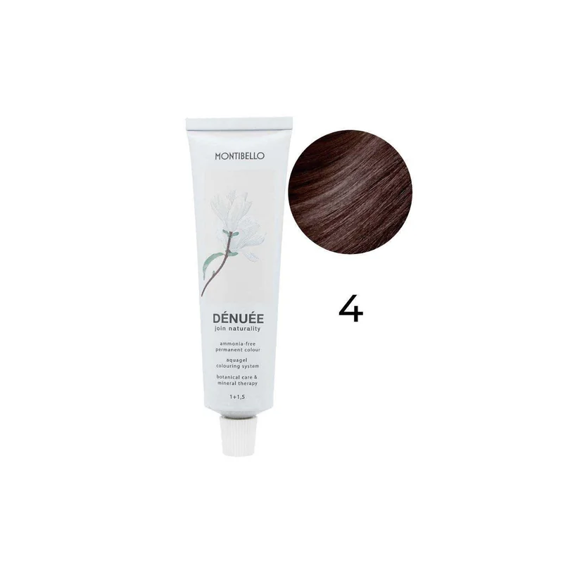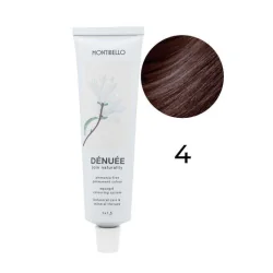 Farba Montibello DÉNUÉE 4 Brąz to pierwsza naturalna i permanentna farba na bazie wody, całkowicie pozbawiona amoniaku. Produkt pozwala uzyskać pełne blasku, naturalnie wyglądające koloryzacje, jednocześnie dbając o kondycję włosów i chroniąc skórę głowy.