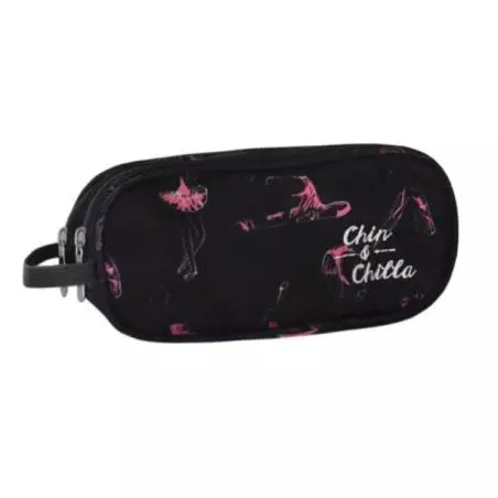 Czarny, dwukomorowy piórnik saszetka w rozmiarze 22 x 7 cm z motywem różowych baletnic.