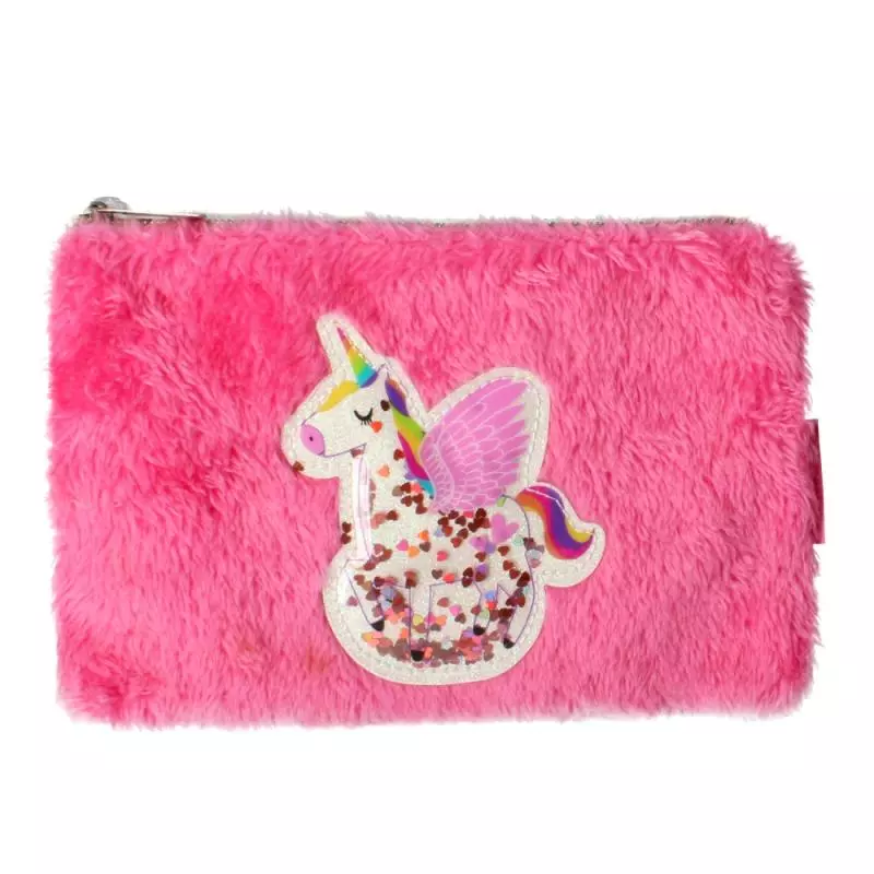 Pluszowy piórnik w kształcie saszetki z zamkiem błyskawicznym.