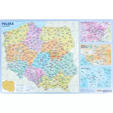 Oprócz cyfrowych oznaczeń kodowych przedstawione są granice okręgów, rejonów i kodów pocztowych. Różnymi kolorami zostały wyróżnione obszary 16 województw, a w ich obrębie zaznaczono granice powiatów.