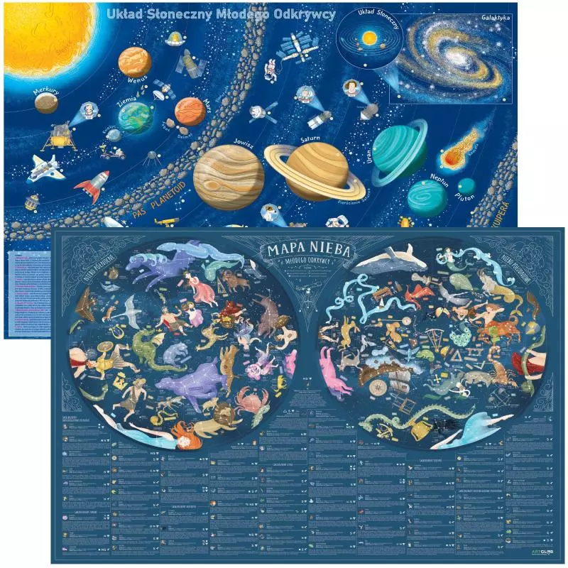 3, 2, 1… Start! Rozpoczynamy poszukiwania Wielkiej Niedźwiedzicy! Z myślą o dzieciach stworzyliśmy mapę, której celem jest przybliżenie im astronomicznych faktów i ciekawostek o układach gwiezdnych. Dzięki starannie wykonanej, bajecznej grafice obfitującej w żywe kolory mapa przyciągnie uwagę każdego ucznia. I kto wie? Być może będzie to początek astronomicznej pasji! Zastosowaliśmy między innymi podział na niebo północne i południowe, a do każdej z opisywanych konstelacji przyporządkowaliśmy właściwy jej symbol oraz dodatkowe fakty – o okresie widoczności danego gwiazdozbioru w Polsce i jego pozycji na liście gwiazdozbiorów, ustalanej według wielkości powierzchni. W dolnej części mapy znajduje się legenda, będąca zbiorem informacji dobranych tak, by w prosty sposób opowiedzieć o fascynującym, kosmicznym świecie. Gwarantujemy, że Mapa Nieba dla dzieci znacznie ułatwi naukę w domowych warunkach oraz dopełni treści zdobyte w szkolnej ławce, na ścianie zwiśnie jako wymarzona ozdoba każdego pokoju, a przewiązana wstążką będzie wymarzonym prezentem Twojej pociechy.Dodatkowo, podkładka posłuży jako ochrona blatu każdego dziecięcego biurka"