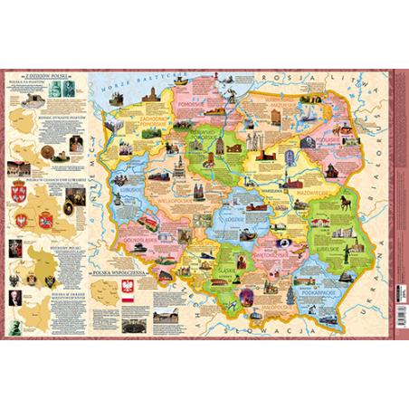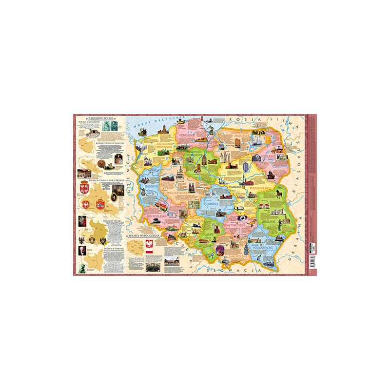 Podkładka zawiera także informacje o historii Polski, pokazuje jak granice naszego państwa zmieniały się na przestrzeni wieków, pozwala porównać powierzchnię Polski w kluczowych momentach jej historii.
