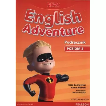 New English Adventure zabierze dzieci w podróż po magicznym świecie Disneya, w którym czeka je niezwykła przygoda z językiem angielskim. Kurs docenią także nauczyciele i rodzice, ponieważ uwzględnia on realia polskiej szkoły, wymagania programowe, a przede wszystkim zróżnicowane potrzeby 6- i 7-letnich pierwszoklasistów. Aż pół miliona polskich dzieci uczyło się angielskiego z serii English Adventure. Zaufaj nam, jesteśmy ekspertami w motywowaniu! Książka ucznia: Spotkanie z nowymi bohaterami bestsellerowych filmów Disneya. Komiks ze stałym bohaterem serii - uwielbianą przez dzieci Myszką Miki - w każdym rozdziale. Wszystkie historyjki są nagrane z użyciem prawdziwych głosów Myszki Miki i jej przyjaciół, a także w wersji lektorskiej (na płycie CD dołączonej do Zeszytu ćwiczeń). Poszerzone słownictwo i więcej ćwiczeń rozwijających psychomotorykę. Sekcje CLIL i powtórzenie w każdym rozdziale. Na dole strony stopka z nowym i powtarzanym słownictwem. Do podręcznika wieloletniego dołączona jest płyta MP3 CD z nagraniami z podręcznika i zeszytu ćwiczeń.