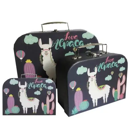 Kuferek w modny wzór lamy i kaktusów, z napisem Love Alpaca. Idealny na letni piknik, schowanie zabawek czy krótką wycieczkę. Zamykany na metalową klamrę, z metalową rączką. Wymiary: 30x22x9,5 cm