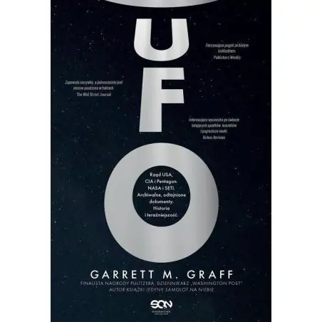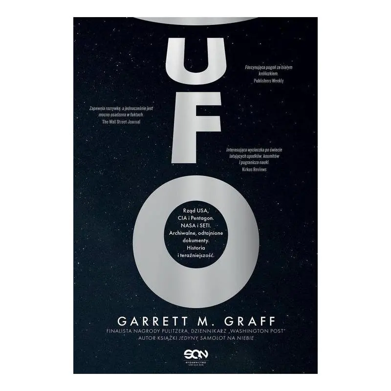 Od momentu, kiedy jako ludzkość spojrzeliśmy w niebo, zadawaliśmy sobie pytanie, czy życie na Ziemi jest jedynym, jakie istnieje. Pytanie to znalazło się w centrum naszych doświadczeń, napędzając debaty naukowe i odkrycia, kształtując wierzenia i skłaniając do rozważań egzystencjalnych nieograniczonych granicami państw ani czasem. Choć to jedno z ulubionych zagadnień naszej kultury, myśl o pozaziemskiej inteligencji została w dużej mierze sprowadzona do rangi fantazji i teorii spiskowych. To porywająca opowieść o nauce, zimnej wojnie, nazistowskich badaniach, niepokojach atomowych, tajnych samolotach szpiegowskich i wyścigu kosmicznym. UFO przedstawia prawdziwą historię polowania rządu USA na „niezidentyfikowane zjawiska powietrzne” tutaj na Ziemi, od Roswell po Rendlesham Forest, a także historię małej grupy myślących przyszłościowo naukowców – astronomów takich jak J. Allen Hynek, Frank Drake, Carl Sagan i Jill Tarter – którzy rozpoczęli poszukiwania pozaziemskiej inteligencji z dala od naszej planety. Opierając się na oryginalnych badaniach archiwalnych, odtajnionych dokumentach i wywiadach z wysokimi rangą urzędnikami wywiadu i wojska, Garrett M. Graff śledzi nasze długotrwałe usiłowania, by odpowiedzieć na jedno z najgłębszych i najpopularniejszych pytań wszech czasów: czy jesteśmy sami? Garrett M. Graff to uznany historyk, finalista Nagrody Pulitzera, dziennikarz „The Washington Post”, a także autor kilku książek, w tym wydanego przez Wydawnictwo SQN reportażu o zamachach z 11 września Jedyny samolot na niebie. *** Zapewnia rozrywkę, a jednocześnie jest mocno osadzona w faktach. The Wall Street Journal Interesująca wycieczka po świecie latających spodków, kosmitów i pogranicza nauki. Kirkus Reviews BIOGRAM: Garrett M. Graff Pisze o polityce, technologii i bezpieczeństwie narodowym od blisko 20 lat. W przeszłości pełnił funkcję redaktora w magazynie „POLITICO”, a także regularnie współpracował z „WIRED” i CNN. Jego teksty ukazywały się w licznych periodykach, od „Esquire” przez „Rolling Stone’a” po „New York Timesa”. Obecnie jest dyrektorem inicjatyw cyfrowych w Aspen Institute. Graff ma na swoim koncie wiele książek, w tym The Threat Matrix poświęconą historii FBI, Raven Rock opisującą plany Stanów Zjednoczonych na wypadek zagłady nuklearnej w czasach zimnej wojny oraz bestsellery „New York Timesa”: nominowaną do Pulitzera Watergate i wreszcie, wydany w Polsce nakładem Wydawnictwa SQN, Jedyny samolot na niebie.