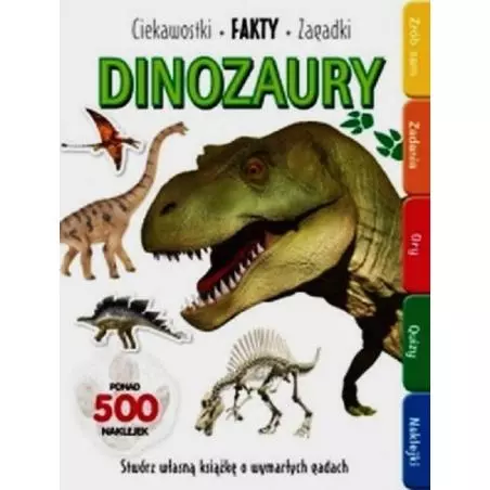 Poznaj ciekawostki i niezwykłe fakty na temat dinozaurów. Stwórz postacie dinozaurów, rysując i kolorując. Rozwiąż zadania, dopasowując skamieniałości i układając naklejkowe puzzle. Uciekaj przed śmiertelnie groźnymi drapieżnikami i weź udział w ekscytujących grach. Odpowiedz na podchwytliwe pytania w quizach i sprawdź, co twoi znajomi wiedzą o erze dinozaurów. Z pomocą naklejek ożyw stronice tej książki! W serii ukazały się: Zwierzęta, Dinozaury, Moda