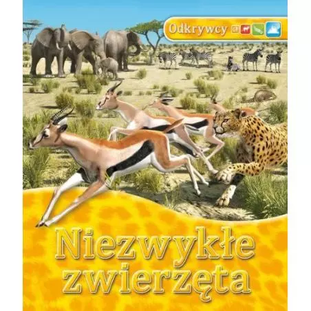 Książeczki Odkrywcy to doskonały początek badawczej wyprawy! Kolorowe, pełne dramaturgii ilustrowane sceny wprowadzają dzieci w ulubioną tematykę i dostarczają mnóstwa informacji. Napisane przejrzystym, przystępnym językiem i pełne fascynujących faktów książki Odkrywcy to nowoczesna i zabawna, godna polecenia lektura dla ciekawych świata młodych czytelników. Szukając kwadratów, które łączą poszczególne sceny w zaskakujący sposób i podążając za nimi, dziecko rozpoczyna swoją wyprawę po książce lub po prostu czyta tekst od początku do końca. Odkryj dżunglę przemierzaną przez dzikich łowców, poznaj mieszkańców sawanny, groźnych drapieżców i niezwykłych budowniczych. Zobacz fascynujące stworzenia, które nieustannie walczą o pokarm i przetrwanie.