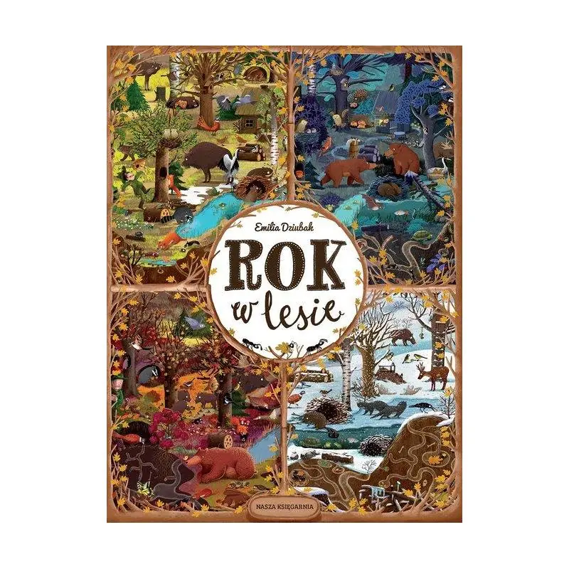 Dziki, wilki, bażanty, niedźwiadek, mrówki, dzięcioł, lisy, borsuk, zaskrońce, żaby, łoś i wiele innych zwierzaków zamieszkuje pewien las. Jak się bawią, a jak odpoczywają? Kto śpi w dzień, a kto w nocy? Kto się z kim lubi? Kto jakie ma przysmaki? Poszukajcie odpowiedzi na kartach tej niezwykłej książki. „Rok w lesie”zawiera dwanaście rozkładówek z kolejnymi miesiącami jednego roku. Każdy miesiąc to ten sam szczegółowo rozrysowany kadr lasu z mieszkańcami pokazanymi w innych sytuacjach, warunkach pogodowych, w innej porze dnia lub nocy. Dwie dodatkowe rozkładówki zawierają prezentację bohaterów i interaktywną zabawę. „Rok w lesie”można oglądać godzinami. Ta niezwykła książka pobudza wyobraźnię, rozwija spostrzegawczość, zdolność logicznego myślenia, szukania związków przyczynowo-skutkowych, umiejętność opowiadania, a przede wszystkim gwarantuje świetną zabawę. Emilia Dziubak – autorka i ilustratorka książek dla dzieci. Absolwentka Akademii Sztuk Pięknych w Poznaniu. Współpracuje z autorami i wydawnictwami w Polsce i za granicą. Laureatka Nagrody Literackiej m.st. Warszawy w 2014 r. Laureatka nagrody „Przecinek i Kropka” w konkursie na najlepszą książkę dziecięcą w 2016 r. Wyróżniona w 2016 r. w konkursie PTWK Najpiękniejsze Książki Roku 2015 za autorską książkę „Rok w lesie”. Laureatka nagrody „Żółta Ciżemka” w 2017 r. W 2018 r. wyróżniona w konkursie Książka Roku Polskiej Sekcji IBBY. Laureatka nagrody Soligatto 2019. Powyższy opis pochodzi od wydawcy.