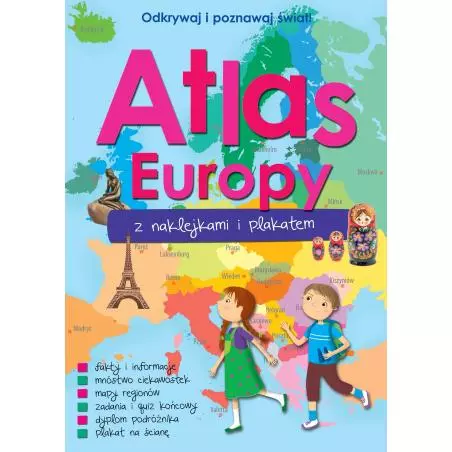 Atlas geograficzny Polski zawiera informacje o parkach narodowych i krajobrazowych, zwierzętach i roślinach Polski, podziale administracyjnym, rekordach geograficznych oraz pokazuje Polskę na tle mapy świata. Miłym dodatkiem do atlasu jest plakat. Atlas Europy zawiera mapę Europy, podział polityczny, krainy geograficzne, informacje na temat ludności poszczególnych państw oraz Unii Europejskiej. W środku dzieci znajdą kolorowe naklejki, które należy umieścić w konkretnych miejscach.