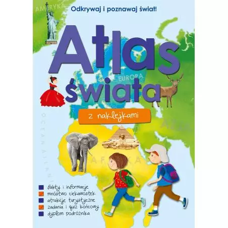 W atlasie znajdziesz mnóstwo informacji o świecie: mapy świata i poszczególnych kontynentów, fakty i ciekawostki o wszystkich kontynentach, rośliny i zwierzęta, które występują w różnych częściach świata, zabytki, atrakcje turystyczne i miejsca warte zwiedzenia, ciekawostki o mieszkańcach różnych stron świata, państwa świata, ich stolice i główne miasta, rekordy geograficzne świata, rekordy w świecie zwierząt.