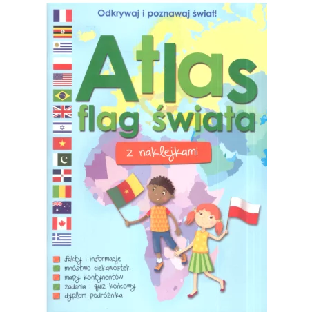 Ciekawe zadania i zabawy z naklejkami pomogą ci zapamiętać jak najwięcej informacji! W atlasie znajdziesz mnóstwo informacji: fakty i ciekawostki o różnych flagach, najczęstsze i najciekawsze motywy na flagach państwowych, listę największych i najmniejszych państw na świecie, ciekawostki o państwach ze wszystkich kontynentów, mapy polityczne poszczególnych kontynentów, nazwy wszystkich państw i ich stolic.