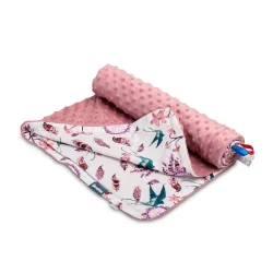 Kocyk Minky Sensillo Retro Róż Ptaki 75x100 cm to połączenie delikatności, komfortu i eleganckiego wzornictwa. Wykonany z dwóch warstw wysokiej jakości tkanin – miękkiej bawełny z nadrukiem w ptaki oraz przyjemnego w dotyku materiału Minky – zapewnia dziecku ciepło i poczucie bezpieczeństwa.