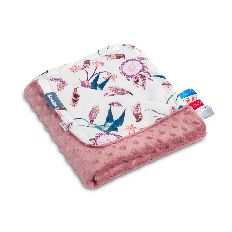 Kocyk Minky Sensillo Retro Róż Ptaki 75x100 cm to połączenie delikatności, komfortu i eleganckiego wzornictwa. Wykonany z dwóch warstw wysokiej jakości tkanin – miękkiej bawełny z nadrukiem w ptaki oraz przyjemnego w dotyku materiału Minky – zapewnia dziecku ciepło i poczucie bezpieczeństwa. Idealny do łóżeczka, wózka lub jako mata do zabawy.