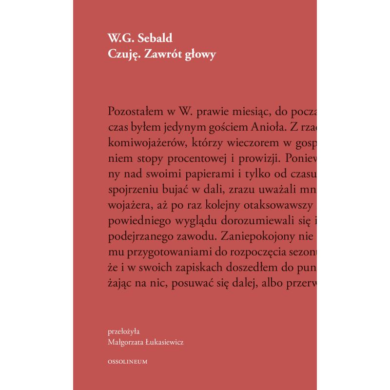 „Czuję. Zawrót głowy” to cztery teksty o podróży. Autor wędruje szlakiem Stendhala, sprawdza, jaki dzień wybrał Casanova na ucieczkę z więzienia, z Kafką przebywa u wód i idzie do kina, okrężnymi drogami trafia w głąb swojego dzieciństwa. Proza Sebalda kocha się w szczegółach. Warto zatrzymać uwagę na mijanym wzgórzu, na przechodniu spacerującym pod parasolem, na współpasażerach w przedziale pociągu, na kloszardach z dworca kolejowego. Literacka podróż nasączona konkretem służy zachowaniu w pamięci wydarzeń teraźniejszych i przypomnieniu minionych, zarówno z historii prywatnej sprzed kilku czy kilkunastu lat, jak i dawniejszej, wspólnej wszystkim ludziom, przekazywanej w listach i dziennikach.