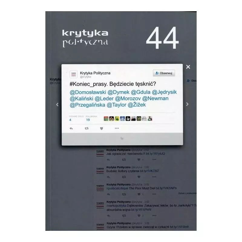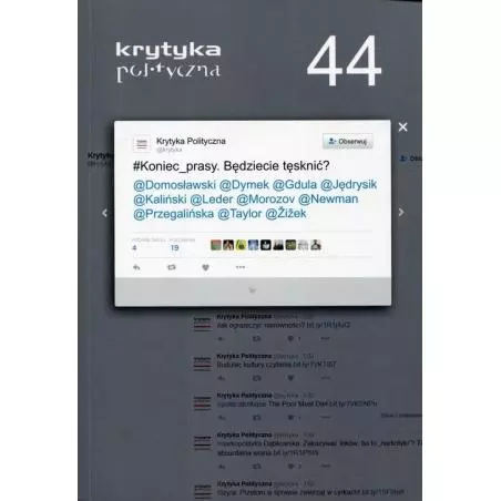 Rozmawiamy o tym wszystkim z dziennikarzami i teoretykami mediów, a wszystkie te przemiany pokazujemy na szerszym tle przeobrażeń społeczno-gospodarczych i politycznych. Wśród autorów m.in. Astra Taylor, Domosławski, Nic Newman (twórca internetowego serwisu BBC), Evgeny Morozov, Dymek, Jedrysik, Gdula, Przegalińska, Wójcik czy Mikołajewska-Zając.