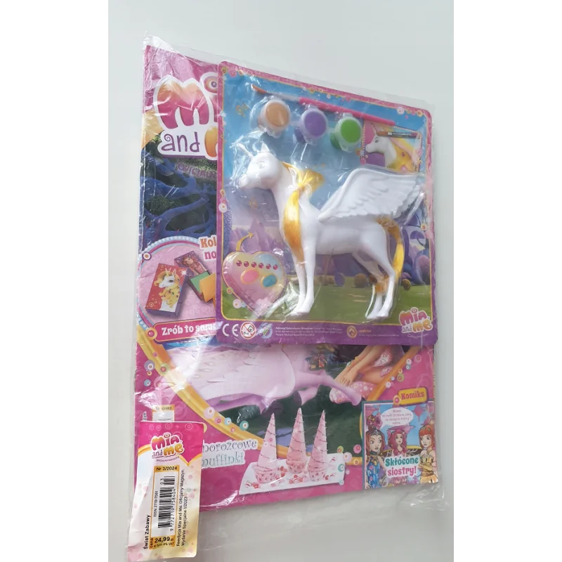 Gazetka „Mia and Me” nr 3/2024 z dodatkiem to wydanie skierowane głównie do dzieci, oparte na popularnej serii animowanej Mia and Me. Zawiera zazwyczaj: krótkie opowiadania i komiksy z bohaterami, zagadki, łamigłówki i kolorowanki, ciekawostki ze świata Centopii, dodatek (prezent) – np. zabawkę, gadżet lub akcesoria tematyczne związane z serialem. To lekka, rozrywkowa publikacja, która łączy zabawę z aktywnościami kreatywnymi dla dzieci.