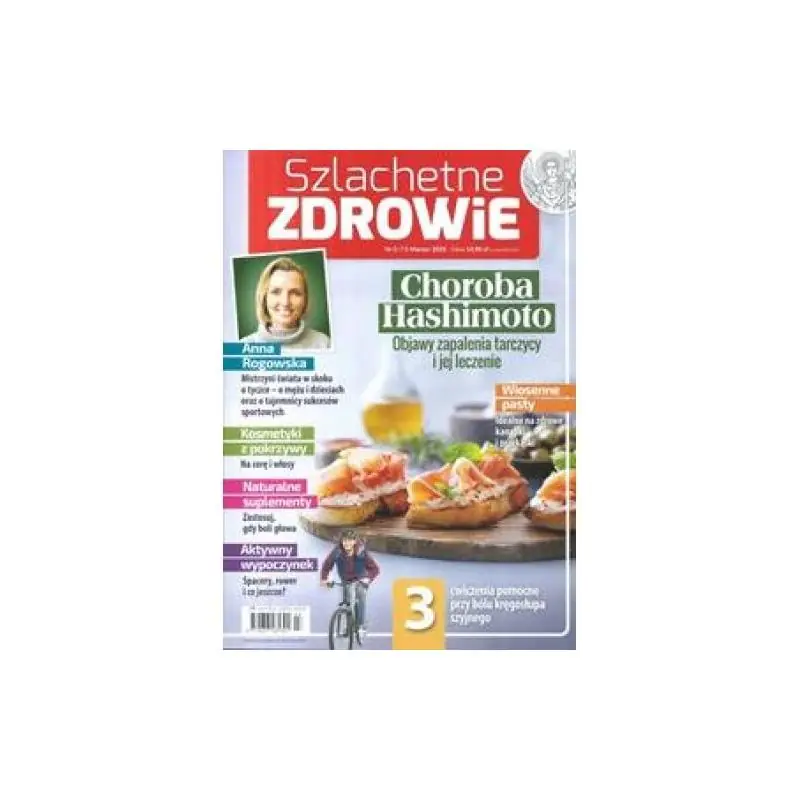 Szlachetne Zdrowie 3/2025 – krótki opis: Marcowe wydanie „Szlachetne Zdrowie” koncentruje się na profilaktyce zdrowia, naturalnych metodach leczenia i zdrowym stylu życia. Temat numeru: choroba Hashimoto – objawy zapalenia tarczycy oraz sposoby leczenia i wsparcia organizmu. W środku znajdziesz m.in.: porady dotyczące naturalnych suplementów (np. na ból głowy), artykuły o zdrowej diecie i prostych przepisach (np. wiosenne pasty), teksty o aktywności fizycznej i ćwiczeniach (np. na kręgosłup szyjny), inspiracje dotyczące pielęgnacji naturalnej (np. kosmetyki z pokrzywy), wywiady i historie osób związanych ze sportem i zdrowym stylem życia. Magazyn ma charakter poradnikowy i popularyzuje holistyczne podejście do zdrowia, łącząc dietę, ruch i naturalne metody wspierania organizmu
