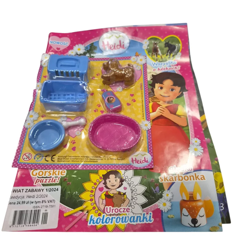 HEIDI – gazetka z dodatkiem 2/2024 to dziecięcy magazyn inspirowany klasyczną historią o dziewczynce wychowującej się w Alpach. Wydanie to przenosi czytelnika do spokojnego, górskiego świata pełnego przygód, przyjaźni i bliskości natury. W środku magazynu znajdują się: opowieści i komiksowe historie z bohaterami świata Heidi treści o życiu w górach i przyrodzie zagadki, quizy i łamigłówki kolorowanki i zadania kreatywne ilustracje i plakaty Całość ma spokojny, ciepły klimat i skupia się na wartościach takich jak przyjaźń, dobroć, rodzina i kontakt z naturą. Do magazynu dołączony jest dodatek-niespodzianka, który może zawierać: figurkę lub mini zabawkę związaną z Heidi akcesoria tematyczne (np. naklejki, drobne gadżety) elementy kolekcjonerskie do zabawy lub wymiany