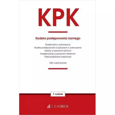 Publikacja zawiera: Kodeks postępowania karnego, Kodeks karny wykonawczy, Kodeks postępowania w sprawach o wykroczenia, Ustawę o postępowaniu w sprawach nieletnich, Ustawę o przeciwdziałaniu narkomanii, Ustawę o opłatach w sprawach karnych, oraz 44 rozporządzenia. Książka adresowana jest do prawników oraz studentów prawa, dla których znajomość obowiązujących przepisów stanowi warunek prawidłowego wykonywania zawodu. Kolejne wydania publikacji uwzględniają najnowsze zmiany, przez co zapewniają bieżącą znajomość prawa. Aktualny stan prawny Czytelne hasła i tekst Przypisy od Redakcji Wyróżnienie najnowszych zmian Wybór aktów prawnych Indeks rzeczowy