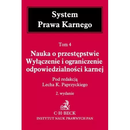 Tom 4 Systemu Prawa Karnego, pod redakcją prof. dr hab. Lecha Paprzyckiego, Prezesa Izby Karnej Sadu Najwyższego, pt. Nauka o przestępstwie, wyłączenie i ograniczenie odpowiedzialności karnej, łącznie z tomem 3, Nauka o przestępstwie, Zasady odpowiedzialności, prezentuje fundamentalną i niezwykle ważną dla prawa karnego problematykę przestępstwa – czyli czynu zabronionego, popełnionego z zamiarem, uznanego za zasadniczo społecznie szkodliwy lub społecznie niebezpieczny, konkretnie zdefiniowanego i zagrożonego karą na mocy prawa karnego. Publikacja ta poświęcona została szczegółowemu przedstawieniu zasad wyłączenia i ograniczenia odpowiedzialności karnej za popełniony czyn.