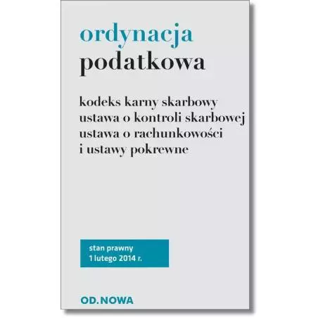 Nowa publikacja Wydawnictwa Od.Nowa - Ordynacja podatkowa i ustawy pokrewne, stanowi zbiór najistotniejszych przepisów dotyczących postępowania podatkowego, kontroli i odpowiedzialności. Zbiór zawiera ustawę Ordynacja podatkowa wraz z aktami wykonawczymi oraz ustawy: o opłacie skarbowej, o rachunkowości, o odpowiedzialności majątkowej funkcjonariuszy publicznych, o odpowiedzialności podmiotów zbiorowych o kontroli skarbowej a także kodeks karny skarbowy. Zaletą książki jest jej praktyczny, poręczny format i przejrzysty układ graficzny. Zbiór zawiera przypisy o ostatnich i planowanych zmianach prawnych. Łatwą orientację w materiale umożliwia obszerny skorowidz. Zmiany oczekujące na wejście w życie umieszczono w ramkach. Kodeks opracowany został przez były zespół redakcyjny Wydawnictwa Park. Stan prawny: 1 lutego 2014r.