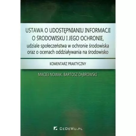 Komentarz skierowany jest przede wszystkim do przedsiębiorców oraz pracowników administracji publicznej. Zawiera szczegółową analizę zagadnień prawnych związanych z: - dostępem do informacji o środowisku, - strategiczną oceną oddziaływania na środowisko, - oceną oddziaływania przedsięwzięcia na środowisko, - obowiązków środowiskowych realizowanych w trakcie procesu inwestycyjnego. Przedmiotowe zagadnienia są przedstawiane w sposób przejrzysty, ze szczególnym uwzględnieniem możliwości wystąpienia problemów praktycznych w tym zakresie. W komentarzu wykorzystano większość dostępnych orzeczeń sądowych dotyczących przedmiotowych kwestii oraz niepublikowane dotąd tezy decyzji wydawanych przez Generalnego Dyrektora Ochrony Środowiska.