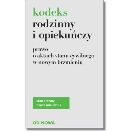 Najnowsza aktualizacja kodeksu rodzinnego i opiekuńczego. Publikacja zawiera tekst jednolity kodeksu wraz z przepisami wprowadzającymi oraz Prawo o aktach stanu cywilnego w nowym brzmieniu. Zaletą książki jest jej praktyczny, poręczny format, przejrzysty układ graficzny i niska cena. Łatwą orientację w materiale umożliwia obszerny skorowidz. Zmiany oczekujące na wejście w życie umieszczone są w ramkach. Stan prawny: 1 września 2015 r.