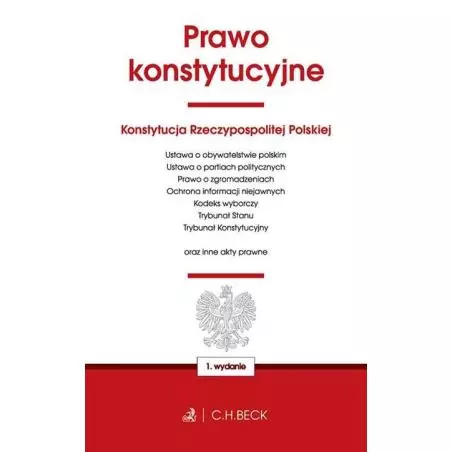 Publikacja zawiera: Konstytucja Rzeczypospolitej Polskiej Ustawa o obywatelstwie polskim Ustawa o partiach politycznych Prawo o zgromadzeniach Ochrona informacji niejawnych Kodeks wyborczy Trybunał Stanu Trybunał konstytucyjny oraz inne akty prawne Najbardziej aktualny stan prawny Czytelne hasła i tekst Przypisy od Redakcji Boldowanie najnowszych zmian Wybór najważniejszych aktów prawnych Indeks rzeczowy.