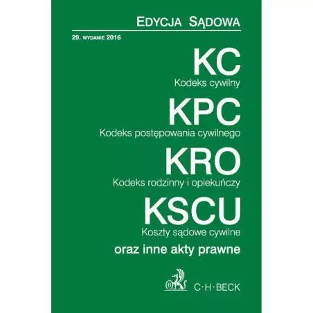 Stan prawny: 1 stycznia 2016 r. Publikacja obejmuje zmiany wchodzące w życie: 1.4.2016 r. (Dz.U. z 2015 r. poz. 4. poz. 218 ze zm., poz. 1311 ze zm.) oraz 17.4.2016 r. (Dz.U. z 2015 r. poz. 1634). Zbiór wydawany jest w twardej oprawie. Format: 145 mm x 205 mm. KC. KPC. KRO. KSCU. Edycja Sądowa zawiera: Kodeks cywilny, Przepisy wprowadzające Kodeks cywilny, Kodeks postępowania cywilnego, Przepisy wprowadzające kodeks postępowania cywilnego, Ustawę o księgach wieczystych i hipotece, Kodeks rodzinny i opiekuńczy, Ustawę - Przepisy wprowadzające Kodeks rodzinny i opiekuńczy, Ustawę o kosztach sądowych w sprawach cywilnych, Prawo prywatne międzynarodowe.