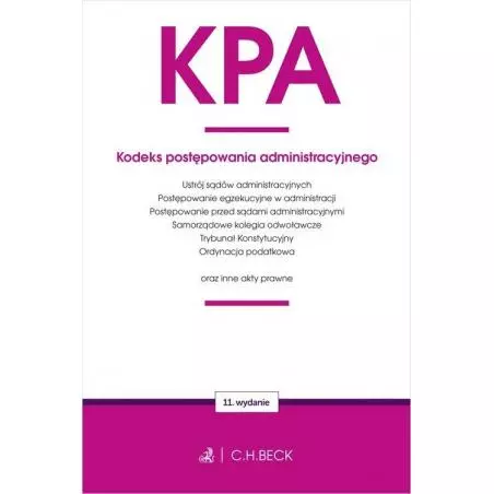Stan prawny: 10 stycznia 2022 r. Publikacja zawiera: Kodeks postępowania administracyjnego, Prawo o ustroju sądów administracyjnych, Prawo o postępowaniu przed sądami administracyjnymi, Przepisy wprowadzające ustawe – Prawo o ustroju sądów administracyjnych i ustawę – Prawo o postepowaniu przed sądami administracyjnymi, Ustawę o postępowaniu egzekucyjnym w administracji, Ordynację podatkową, Ustawę o organizacji i trybie postępowania przed Trybunałem Konstytucyjnym, oraz 27 rozporządzeń. Książka adresowana jest do prawników oraz studentów prawa, dla których znajomość obowiązujących przepisów stanowi warunek prawidłowego wykonywania zawodu. Kolejne wydania publikacji uwzględniają najnowsze zmiany, przez co zapewniają bieżącą znajomość prawa. Aktualny stan prawny Czytelne hasła i tekst Przypisy od Redakcji Wyróżnienie najnowszych zmian Wybór aktów prawnych Indeks rzeczowy