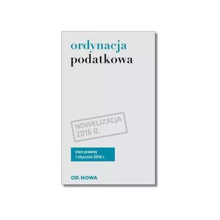 Nowa publikacja Wydawnictwa Od.Nowa - Ordynacja podatkowa stanowi zbiór najistotniejszych przepisów dotyczących postępowania podatkowego, kontroli i odpowiedzialności. Zbiór zawiera ustawę Ordynacja podatkowa wraz z aktami wykonawczymi. Zaletą książki jest jej praktyczny, poręczny format i przejrzysty układ graficzny. Zbiór zawiera przypisy o ostatnich i planowanych zmianach prawnych. Łatwą orientację w materiale umożliwia obszerny skorowidz. Zmiany oczekujące na wejście w życie umieszczono w ramkach. Pozycja szczególnie warta nabycia z uwagi na obszerną nowelizację wprowadzoną dziennikiem ustaw z 2015 r. poz. 1649, która wchodzi w życie 1 stycznia 2016 r. Stan prawny: 15 stycznia 2016 r.