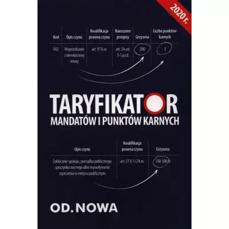 Taryfikator mandatowy zawiera treść Rozporządzenia Ministra Spraw Wewnętrznych w sprawie postępowania z kierowcami naruszającymi przepisy ruchu drogowego, wykaz naruszeń przepisów ruchu drogowego i liczbę punktów odpowiadającą tym naruszeniom, wysokość grzywien określonych w załączniku do Rozporządzenia Prezesa Rady Ministrów w sprawie wysokości grzywien nakładanych w drodze mandatów karnych za wybrane rodzaje wykroczeń. Największą zaletą tej pozycji jest zestawienie w jednej tabeli naruszenia przepisu z punktami karnymi, wysokością grzywny oraz kodem naruszenia. Wyszukiwanie ułatwia przejrzysty układ (w tym wizualizacja w postaci kolorowych znaków drogowych) oraz skorowidz. Stan prawny marzec 2020 r.