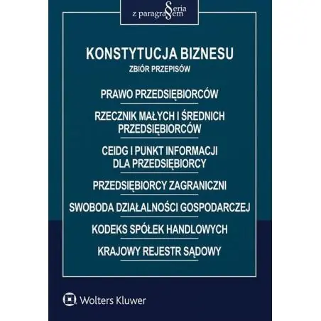 W zbiorze zamieszczono ustawy tworzące tzw. Konstytucję biznesu:- Prawo przedsiębiorców - reguluje ogólne zasady w zakresie podejmowania, wykonywania i zakończenia działalności gospodarczej na terytorium Rzeczypospolitej Polskiej, w tym wiążące przedsiębiorców oraz organy władzy publicznej w ich relacjach z przedsiębiorcami;- o Rzeczniku