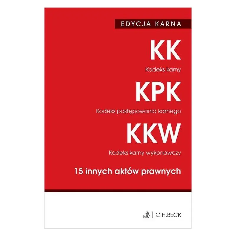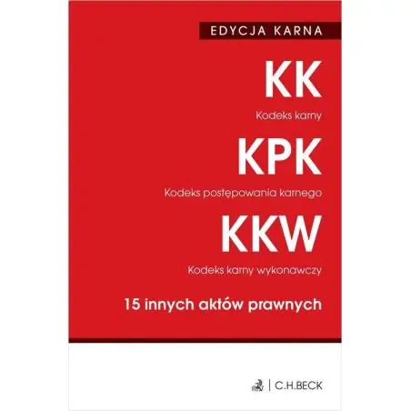 Stan prawny: 1 stycznia 2025 r. Zbiór uwzględnia zmiany wchodzące w życie: Kodeks karny: 1.1.2025 r. – Ustawa o ochronie ludności i obronie cywilnej z dnia 5 grudnia 2024 r. (Dz.U. z 2024 r. poz. 1907), 1.2.2025 r. – Ustawa o zmianie ustawy o dniach wolnych od pracy oraz niektórych innych ustaw z dnia 6 grudnia 2024 r. (Dz.U. z 2024 r. poz. 1965), 13.2.2025 r. – Ustawa o zmianie ustawy – Kodeks karny oraz niektórych innych ustaw z dnia 28 czerwca 2024 r. (Dz.U. z 2024 r. poz. 1228). Kodeks postępowania karnego: 31.8.2024 r. – Ustawa o zmianie niektórych ustaw w celu usprawnienia działań Sił Zbrojnych Rzeczypospolitej Polskiej, Policji oraz Straży Granicznej na wypadek zagrożenia bezpieczeństwa państwa z dnia 26 lipca 2024 r. (Dz.U. z 2024 r. poz. 1248), 10.11.2024 r. – Przepisy wprowadzające ustawę – Prawo komunikacji elektronicznej z dnia 12 lipca 2024 r. (Dz.U. z 2024 r. poz. 1222), 1.10.2028 r. – Ustawa o doręczeniach elektronicznych z dnia 18 listopada 2020 r. (Dz.U. z 2020 r. poz. 2320 ze zm.), 1.10.2029 r. – Ustawa o doręczeniach elektronicznych z dnia 18 listopada 2020 r. (Dz.U. z 2020 r. poz. 2320 ze zm.). Kodeks karny wykonawczy: 1.1.2025 r. – Ustawa o ochronie ludności i obronie cywilnej z dnia 5 grudnia 2024 r. (Dz.U. z 2024 r. poz. 1907), 1.1.2026 r. – Ustawa o zmianie ustawy - Kodeks karny oraz niektórych innych ustaw z dnia 7 lipca 2022 r. (Dz.U. z 2022 r. poz. 2600 ze zm.). Kodeks wykroczeń: 1.1.2025 r. – Ustawa o ochronie ludności i obronie cywilnej z dnia 5 grudnia 2024 r. (Dz.U. z 2024 r. poz. 1907), 18.4.2026 r. – Ustawa o zmianie ustawy o ochronie konkurencji i konsumentów oraz niektórych innych ustaw z dnia 5 sierpnia 2015 r. (Dz.U. z 2015 r. poz. 1634). Kodeks postępowania w sprawach o wykroczenia: 1.11.2024 r. – Ustawa o zmianie ustawy o delegowaniu kierowców w transporcie drogowym oraz niektórych innych ustaw z dnia 25 września 2024 r. (Dz.U. z 2024 r. poz. 1544), 1.10.2029 r. – Ustawa o doręczeniach elektronicznych z dnia 18 listopada 2020 r. (Dz.U. z 2020 r. poz. 2320 ze zm.). Kodeks karny skarbowy: 1.1.2025 r. – Ustawa o opodatkowaniu wyrównawczym jednostek składowych grup międzynarodowych i krajowych z dnia 6 listopada 2024 r. (Dz.U. z 2024 r. poz. 1685), 1.1.2025 r. – Ustawa o zmianie ustawy o podatku od towarów i usług oraz niektórych innych ustaw z dnia 8 listopada 2024 r. (Dz.U. z 2024 r. poz. 1721). Ustawa o wspieraniu i resocjalizacji nieletnich: 13.2.2025 r. – Ustawa o zmianie ustawy – Kodeks karny oraz niektórych innych ustaw z dnia 28 czerwca 2024 r. (Dz.U. z 2024 r. poz. 1228). Ustawa o odpowiedzialności podmiotów zbiorowych za czyny zabronione pod groźbą kary: Nowy tekst jednolity z dnia 6 grudnia 2024 r. (Dz.U. z 2024 r. poz. 1822). Ustawa o ochronie i pomocy dla pokrzywdzonego i świadka: 13.2.2025 r. – Ustawa o zmianie ustawy – Kodeks karny oraz niektórych innych ustaw z dnia 28 czerwca 2024 r. (Dz.U. z 2024 r. poz. 1228). EDYCJA KARNA zawiera 18 aktów prawnych: Kodeks karny, Przepisy wprowadzające Kodeks karny, Kodeks postępowania karnego, Przepisy wprowadzające Kodeks postępowania karnego karny, Kodeks karny wykonawczy, Kodeks wykroczeń, Przepisy wprowadzające Kodeks wykroczeń, Kodeks postępowania w sprawach o wykroczenia, Przepisy wprowadzające Kodeks postępowania w sprawach o wykroczenia, Kodeks karny skarbowy, Przepisy wprowadzające Kodeks karny skarbowy, Ustawę o wspieraniu i resocjalizacji nieletnich, Ustawę o przeciwdziałaniu narkomanii, Ustawę o odpowiedzialności podmiotów zbiorowych za czyny zabronione pod groźbą kary. Ustawę o wychowaniu w trzeźwości i przeciwdziałaniu alkoholizmowi, Ustawę o świadku koronnym, Ustawa o ochronie i pomocy dla pokrzywdzonego i świadka, Ustawę o opłatach w sprawach karnych,