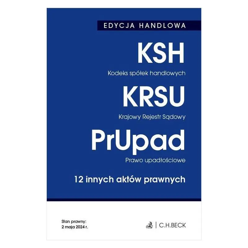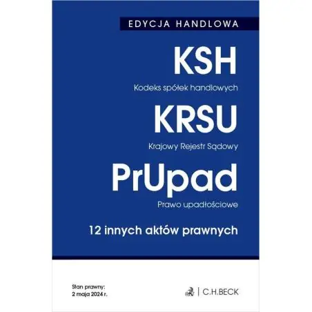 Stan prawny: 2 maja 2024 r. Dostęp online - do wszystkich aktów prawnych zawartych w zbiorze, aktualizowanych na bieżąco. EDYCJA HANDLOWA zawiera 15 aktów prawnych: Kodeks spółek handlowych, Kodeks cywilny - wyciąg, Ustawa o Krajowym Rejestrze Sądowym, Ustawa – Przepisy wprowadzające ustawę o Krajowym Rejestrze Sądowym, Ustawa o Krajowym