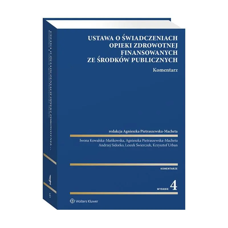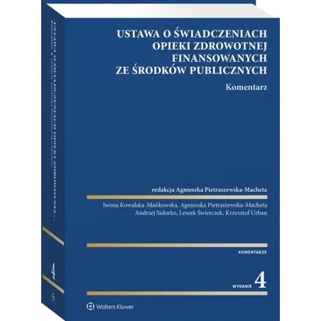 Publikacja w sposób przystępny omawia najważniejszą ustawę określającą zasady funkcjonowania systemu opieki zdrowotnej w Polsce. Książkę opracowali prawnicy praktycy, w tym również pracujący od wielu lat w Narodowym Funduszu Zdrowia, na co dzień stykający się z problemami finansowania świadczeń ze środków publicznych. W czwartym wydaniu omówiono ostatnie zmiany w systemie ochrony zdrowia, w tym m.in.: – nowe zasady dotyczące centralizacji procesu kontroli w zarządzaniu Narodowym Funduszem Zdrowia; – utworzenia Funduszu Medycznego w celu finansowania świadczeń opieki zdrowotnej; – zmiany w organizacji Narodowego Funduszu Zdrowia dotyczące modyfikacji systemu opracowania i wdrażania map potrzeb zdrowotnych oraz odnoszące się do systemu finansowania świadczeń opieki zdrowotnej. Oprócz przedstawienia poglądów, zaprezentowano praktyczne rozwiązania dotyczące zastosowania przepisów komentowanej ustawy w praktyce, jak również bogaty wybór literatury i orzecznictwa sądów powszechnych i administracyjnych. Książka jest przeznaczona dla pracowników oraz właścicieli podmiotów leczniczych publicznych i niepublicznych. Ponadto może stanowić cenną lekturę dla pracowników Narodowego Funduszu Zdrowia. Zainteresuje również sędziów, radców prawnych i adwokatów.