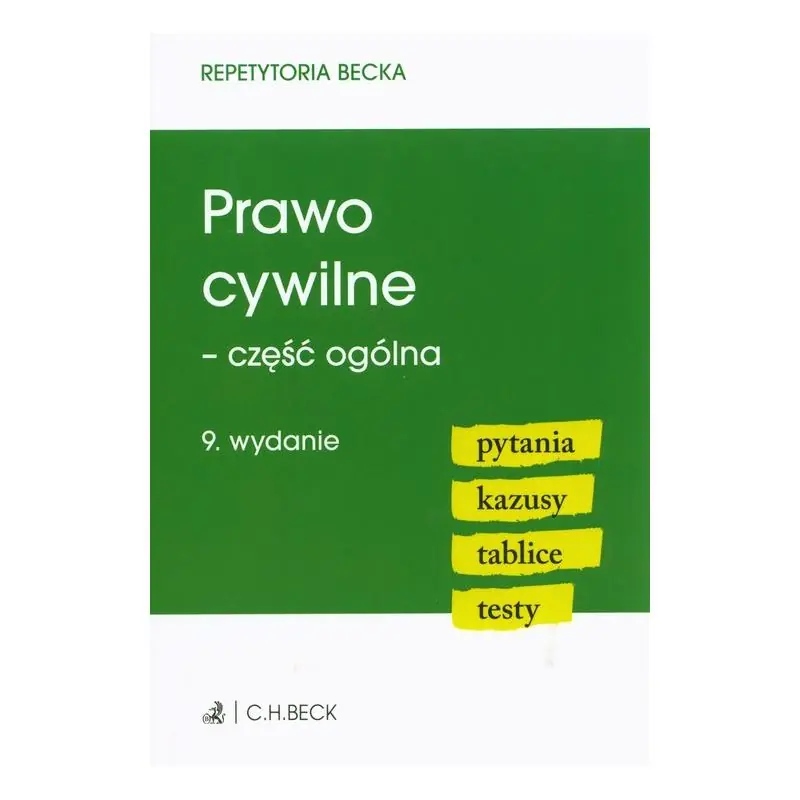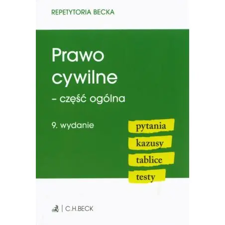Prawo cywilne – część ogólna prezentuje i porządkuje najważniejsze zagadnienia uregulowane w pierwszej Księdze Kodeksu cywilnego. Dzięki publikacji sprawnie przyswoisz wiedzę, poznasz podstawy najważniejszych zagadnień, a na koniec sprawdzisz, ocenisz i uzupełnisz ewentualne braki w przygotowaniu do egzaminu. Zagadnienia zostały opracowane przez specjalistów i są oparte o aktualny stan prawny. Repetytorium składa się z czterech części: PYTANIA Z ODPOWIEDZIAMI – zawierające niezbędne informacje z danej dziedziny prawa oraz odpowiedzi z właściwą podstawą prawną oraz odesłaniem do konkretnego artykułu. KAZUSY Z ROZWIĄZANIAMI – oparte na aktualnym stanie prawnym i przykładowym orzecznictwie, uczące prawniczego myślenia. TABLICE – czytelnie prezentujące zagadnienia i ułatwiające wzrokowe zapamiętanie haseł i definicji. TESTY – sprawdzające poziom przygotowania z danej tematyki. Problematyka zawarta w książce dotyczy m.in.: Ogólnej charakterystyki prawa cywilnego, Prawa podmiotowego, Osoby fizycznej i prawnej, Szczególnych podmiotów stosunków cywilnoprawnych, Form czynności prawnych, Wad oświadczenia woli, Sankcji wadliwej czynności prawnej, Przedstawicielstwa . Książka zawiera: Praktyczne pomoce w formie pytań i kazusów. Ponad 250 pytań testowych. Przejrzystą prezentację treści w formie tablic i schematów. Prawie 400 stron czystej wiedzy -> przekonaj się sam!